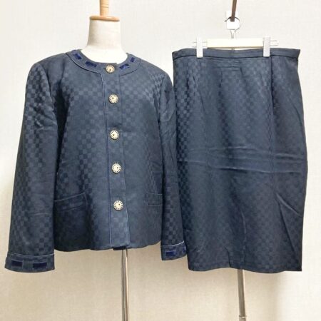 出張買取でレリアンのセットアップを買取しました。物静かな紺色が聡明さに拍車をかける1点。他のお洋服の邪魔をしない色合いなので色々なところで使っていただけそうです。