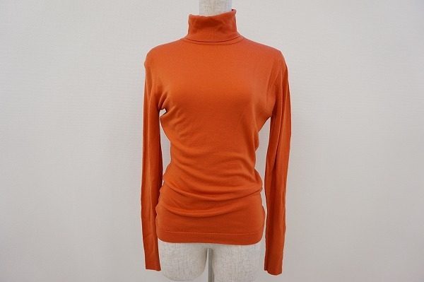 こちらのタートルネックのカットソーは鮮やかなオレンジが目を引く一枚となっています。ジャケットのインナーとして差し色にしても素敵ですし、デニムに一枚で合わせても上品な大人カジュアルスタイルを楽しめますね。