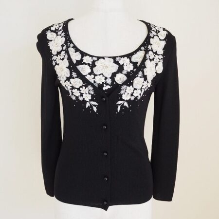 ジャンフランコフェレのアンサンブルを出張買取ご利用のお客様より買取しました。白で清潔感のある花モチーフが目を引きます。胸元が細身の方でも気軽に楽しく着ていただけそうです。