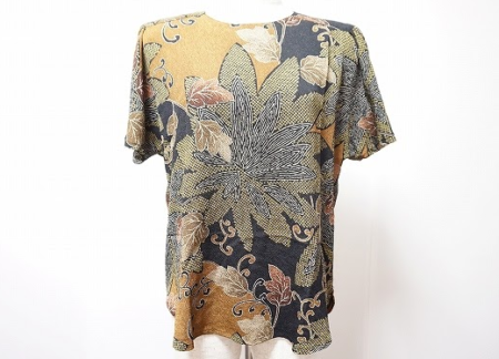今回ご紹介するのは草花がモチーフのアイテム、洋風な草花は多く見かけますが詩仙堂のように和風な草花のモチーフだと途端に個性的で視線を集めますね。大人女性ならではの落ち着きを感じさせる辛子色×黒の半袖カットソーはシンプルなボトムスと合わせてもコーデが決まりアクセントとなるアイテムを取り入れる必要もないほど!美品なので抵抗無く着れるかと思われます。