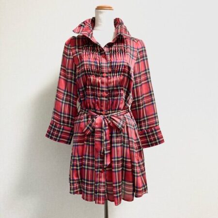出張買取ご利用のお客様より銀座マギーのワンピースを買取しました。サイズは38号です。赤系チェックのカジュアルさもありつつ、銀座マギーならではの落ち着いた大人女性の雰囲気が存分に出ている1着。