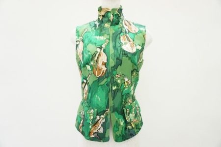 鮮やかなグリーンに描かれた、楽器を弾く人々などが手描きタッチで描かれており、とても印象的なお洋服です。