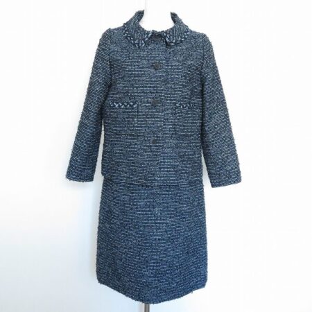 落ち着いたツイード具合が素敵なハナエモリのスカートスーツ。宅配買取ご利用のお客様より買取しました。サイズは38号です。どんなカラーも落ち着かせてくれるネイビーベースがありがたいですね。襟が丸く可愛いです。