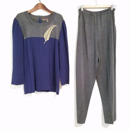 出張買取で斉藤都世子のセットアップを買取しました。細いボーダー柄がカッコよく穏やかな雰囲気にもしてくれる1点。羽柄という変わったアクセントも個性を出せるポイントです。