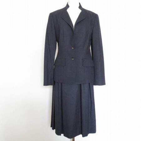 しなやかで柔らかな雰囲気を感じるヨシエイナバのスカートスーツ。宅配買取ご利用のお客様より買取しました。優しく広がるキューティなデザイン。ダークな紺ですが暗くなり過ぎずに着ていただけます。別々でも幅広く使えそうな万能ツーピースです。
