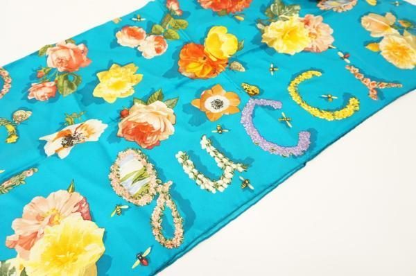 こちらのスカーフも、そのグッチのアイテムです。まず、目を見張るような鮮やかなコバルトブルーが印象的です。しかしながら、単純に明るいイメージを残すことはなく、どこか儚げな深みのあるブルーでもあります。