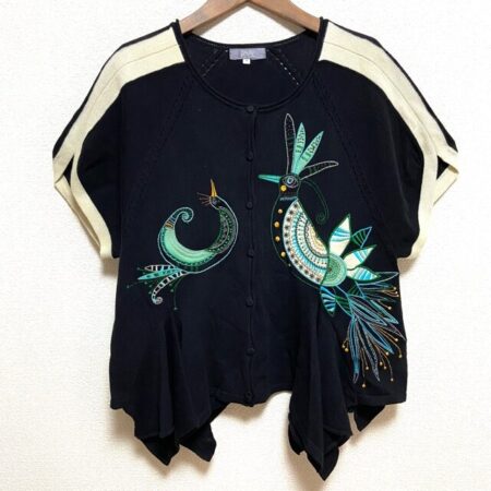 出張買取にてトクコのカーディガンを買取しました。サイズは9号です。今にも羽ばたいていきそうな鳥。綺麗な色合いに心が和みます。黒でインパクトはありますが、半袖なのでスッキリ爽やかに着てもらえるのではないかと思います。