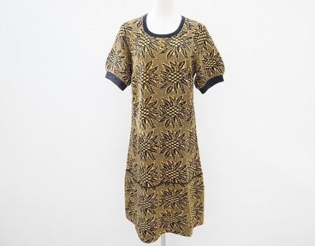 夏でもサラリと着心地抜群でいて素敵デザインのニットを世に出して人気の斉藤都世子。今回お売り頂いたお品物はこれから暑い季節に元気をくれそうな黄色と向日葵柄がポップでお勧めな半袖ニットのワンピース。袖は可愛らしいパフスリーブデザインで、首回りはスクエアネックでデコルテをヘルシーに出すデザイン。どちらも今の流行にピッタリのアイテムで大活躍してくれそうです。