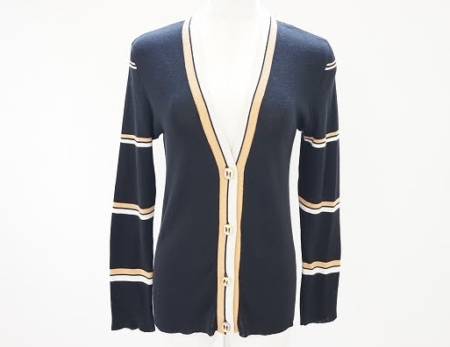 ベーシックなVネックの細身デザインの長袖カーディガン。上質なニットで編み上げられ着心地抜群でいてブラックにブランドカラーのオレンジと明るいホワイトが上品な大人カジュアルな雰囲気を演出します。肌寒く感じる季節に軽い羽織として重宝する1枚です。長く使えるデザインの物は上質な素材の物を選ぶと流行りに左右されずに毎年使えるのでお勧めです。