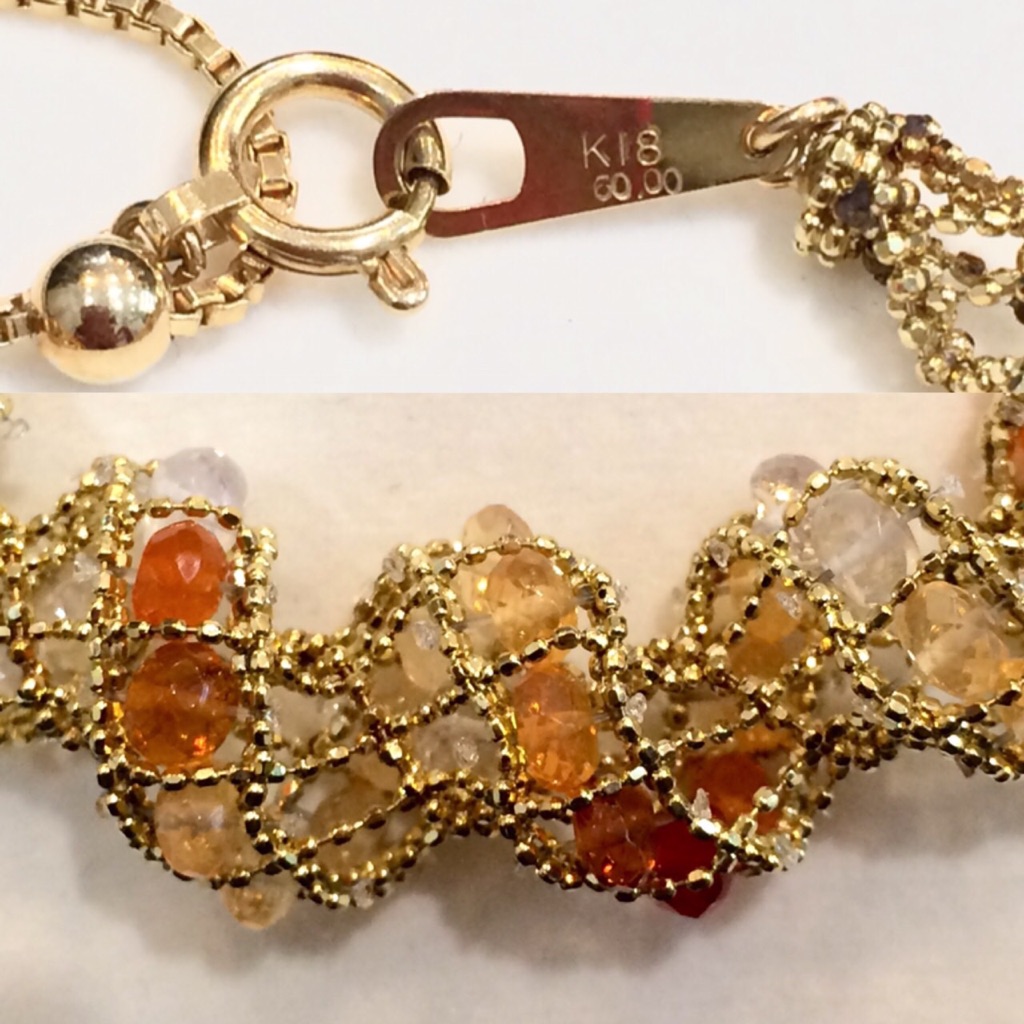 18金のチェーンをねじりながら編み上げたようなデザインで、その中に白、黄色、オレンジの水晶を上品に並べてあります。