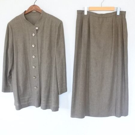 出張買取にてレリアンのセットアップを買取しました。濃すぎない茶色と麻の柔らかい感じにほっこりします。ドイツ製生地を使用しているという点もレアで見どころでもあります。