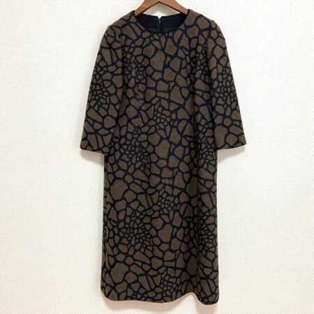 ジュンアシダのワンピースを買取しました。サイズは11号です。茶と黒の組み合わせや柄がインパクトがあり、貫禄すらも表現してくれます。袖もしっかりあるため涼しく快適にも着られます。