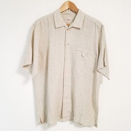パパスの半袖シャツを買取しました。サイズはLです。麻素材を使用しております。ベージュの色合いも優しく穏やかで好印象になること間違いなしでしょう。無地から柄物まで様々なパンツと使用していただけます。