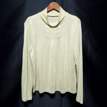 出張買取にてレリアンのカットソーを買取しました。ハイネックです。珍しいゴールドカラー。ギラギラした感じも少なく優しさすら感じさせてくれます。ゴージャスなスカートと合わせていただいてもOKです。