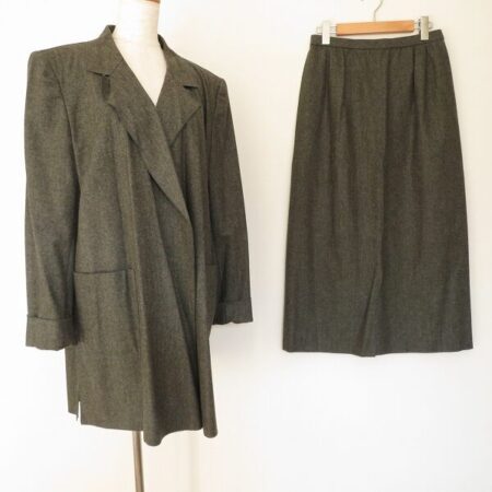 レリアンのスカートスーツを出張買取ご利用のお客様より買取しました。サイズは13号です。珍しい雰囲気の深緑が印象的なツーピース。謎めいた印象を出してくれます。寒色にも暖色にも合わせやすいのが嬉しいですね。