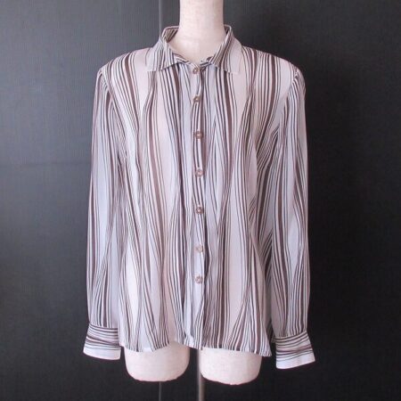 レリアンのシャツを出張買取ご利用のお客様より買取しました。白と茶色という面白い組み合わせのストライプです。茶色のシックでどこか都会的な雰囲気、白の爽やかな感じがマッチしオシャレな女性を作り上げてくれます。