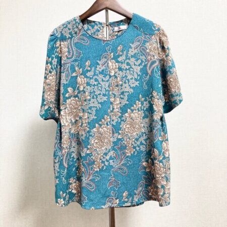 詩仙堂のカットソーを買取しました。出張買取です。綺麗な水色に咲くお花が美しい芸術的な1枚。モノトーン調のボトムス、デニム調のボトムスなど様々なタイプと着飾るのが楽しみになりそうな1点。