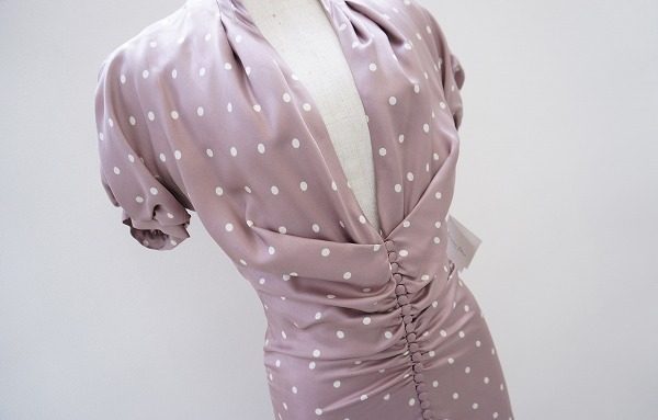 今回ご紹介するのは、フロントのデザインがとても印象的なワンピースです。細身に仕上げられた華やかなシルエットを、ドット柄で見事に親しみやすいデザインへとアップデートしています。首元は縦に長く開かれており、顔周りをスッキリと見せてくれます。大切な日に是非着てみたい一着ですね。