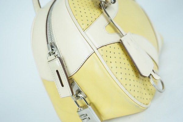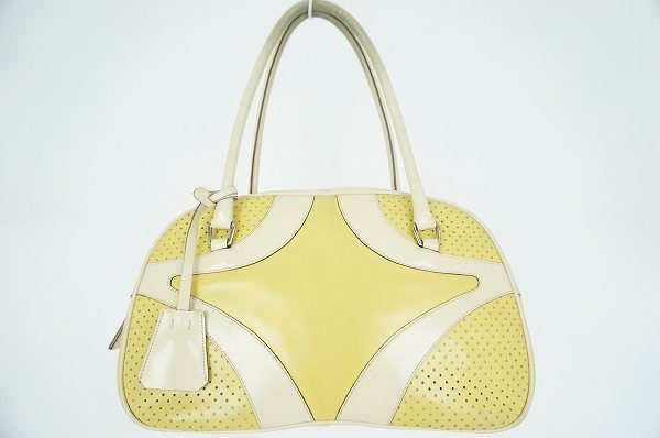 プラダのイエロー×オフホワイトのボストンバッグを買取致しました。