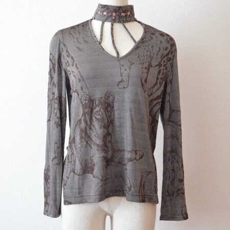 女性のポイントともいえるデコルテをチラ見せできる伊太利屋のカットソー。出張買取ご利用のお客様より買取しました。シックなブラウンではっきりしすぎないトラ柄がセクシーに決まります。