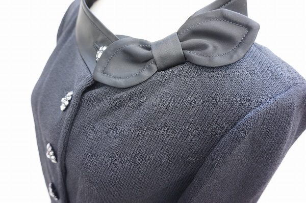 トップスの大きいシルバーのボタンと襟元のリボンのあしらいが、また一層の女性らしさを感じさせますね。