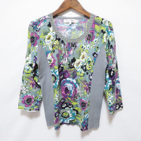 スーパービューティのカットソーを出張買取ご利用のお客様より買取しました。42サイズです。綺麗な色合いのお花が見事に並んで楽しくさせてくれます。顔のトーンを上げたい時にもおすすめです。