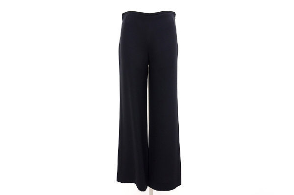 アルマーニコレツィオーニはアルマーニのややカジュアルなビジネスラインです。こちらのパンツはレディースになります。スラッと足長効果のあるワイドなシルエットは働く女性に人気のスタイル。ベルトループやポケットをあえて排除し、着用に使用するファスナーもサイドに設けることで、一段とスッキリとさせています。こういった引き算のデザインはアルマーニが得意とするところであり、この潔さが魅力でもありますね。イメージカラーであるシャープなブラックが一層、際立ちます。