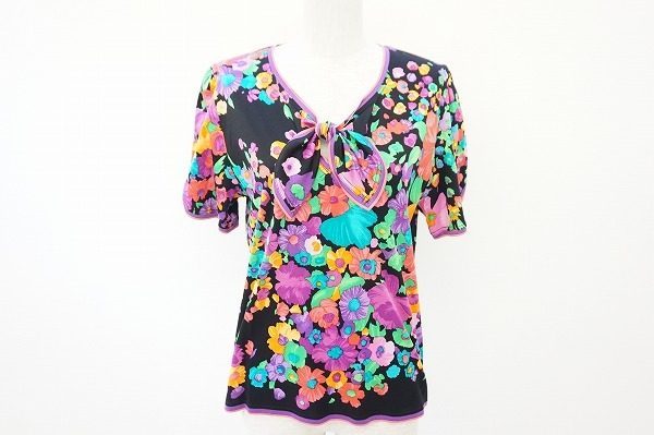 こちらのカットソーもレオナールのものです。素材はコットン、スタイルは半袖のカットソーです。特徴として見受けられる、胸元のリボンや袖口の合わせ、そして配色などはどことなく東アジアをイメージしているようにも思われます。