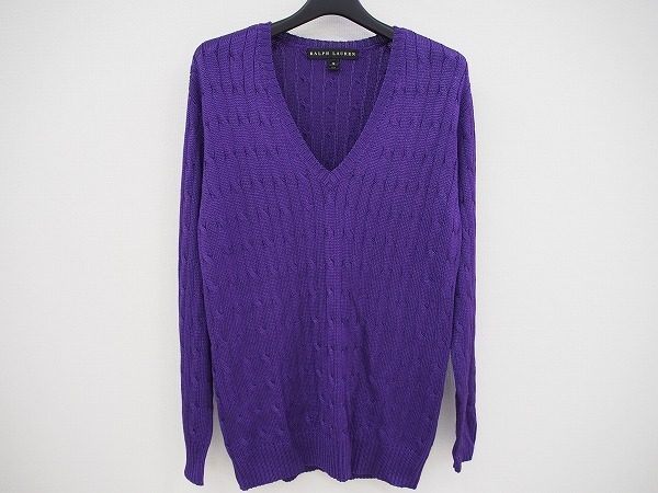 今回、こちらでご紹介させていただくのは、ラルフローレンのレディース向けのセーターになります。鮮やかな紫がとてもステキなお品物となっています。素材には、シルクがふんだんに使われているので、セーター独特のチクチクした感じは一切ありません。