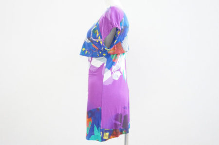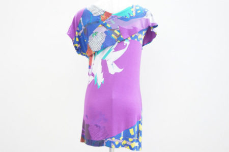 発色がきれいなパープルにちりばめられたランダムな柄がかわいらしいチュニックです。
