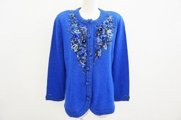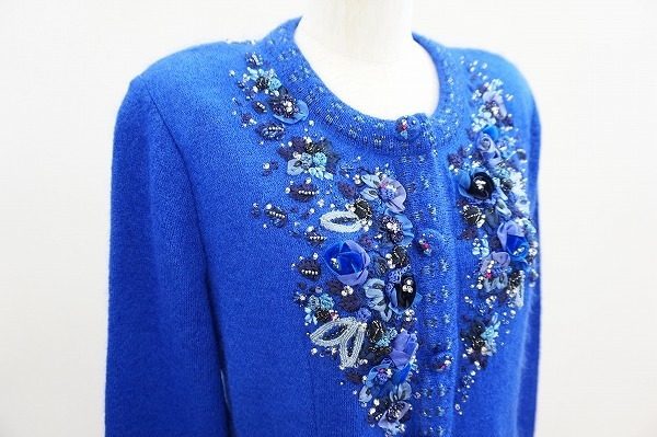 今回ご紹介させていただくのは、アトリエサガンのカーディガンになります。ビーズなどの装飾にこだわったこちらのカーディガンは、大人の女性の雰囲気を演出し、気品に満ち溢れています。ゴージャスなデザインなので、よそ行きのお洋服としてもオススメです。
