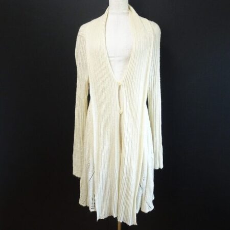 出張買取にてヒロコビスのカーディガンを買取しました。アイボリーの輝きを感じられるカーディガン。フリルもあるのでシンプルになり過ぎず上品に使っていただけます。ほんのり揺れるのもいいですね。