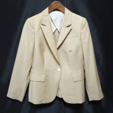 出張買取にてアクアスキュータムのジャケットを買取しました。サイズは8です。ベージュ特有のたおやかな雰囲気がありつつもいい具合のボリュームがあり迫力を感じられます。モヘヤやシルクが入った高級感溢れるジャケットです。
