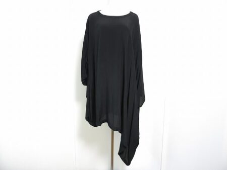 シンプルなブラックワンピースですが、アシメトリーな裾で、簡単にオシャレ感を演出します。
