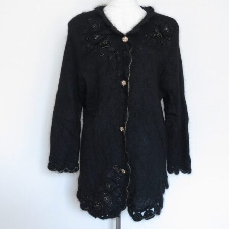 全体的に温和な雰囲気を感じるアトリエサガンのカーディガン。出張買取ご利用のお客様より買取しました。Lサイズです。シルクやモヘヤが入っているためどこか柔らかさを出してくれます。明るめのトップスやワンピースの上から着ていただくのもおすすめです。