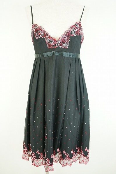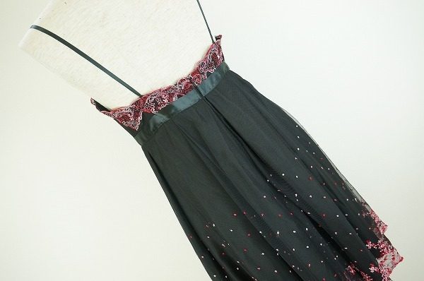 こちらの黒のキャミソールワンピースは、まさにアナスイを体現しているアイテム。胸元とスカートにあしらわれた繊細な刺繍が目をひきます。