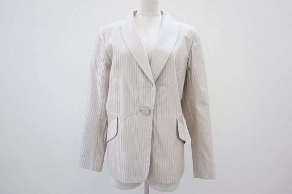 今回、こちらでご紹介させていただくのは、アニエスベーのレディース向けジャケットになります。薄っすらとストライプが入っており、淡い色合いが落ち着いた大人の雰囲気を感じさせるアイテムです。