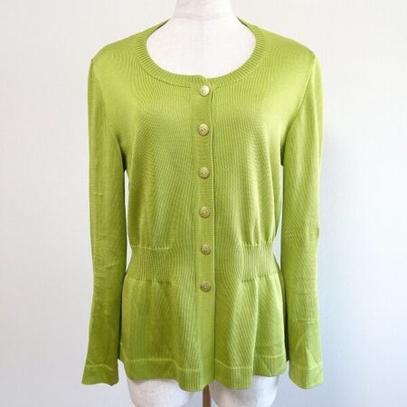 主張が過ぎることなく綺麗さをアピールできる黄緑が素敵なカーディガン。イダスクラッチのお洋服です。出張買取にて買取いたしました。ボタンが金なのでよりゴージャス感を与えてくれる1着です。
