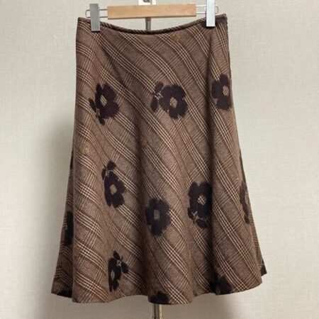 エムズグレイシーのスカートを買取しました。サイズは38。レトロな茶色にシンプルなお花とチェックがよく合った1枚です。秋から冬にかけてブーツなどとも合わせていただきやすいですね。