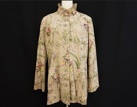 スタンドネックに流れるような草木の総柄がエレガントなバラ色の暮らしのジャケットをお客様のお売りいただきました。ライトアウターとして今シーズンは人気のジャケット!こちらの商品はコーデュロイでカジュアルな素材ですがエレガントな柄と組み合わせる事で大人カジュアルな雰囲気にしてくれます。保管状態が良くて美品ですので古着の中でも新品同様な物を探し出したいかたにお勧めです。