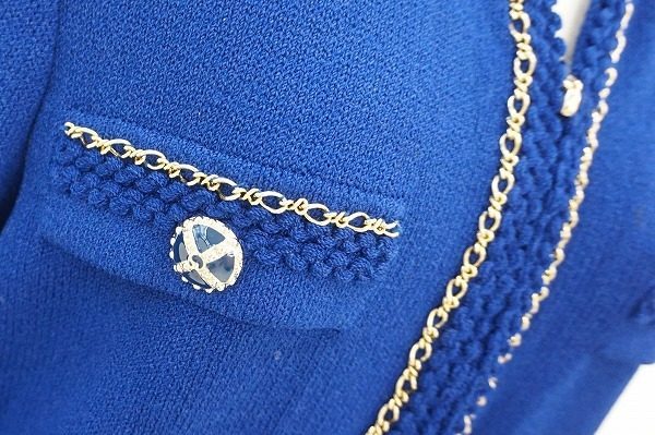 目の覚めるようなロイヤルブルーとポイント使いのチェーンのチャームは、ゴージャスで華やか。マニッシュなスーツには無い、ニット特有のフェミニンさと大人の女性らしさが合わさった着こなしが実現します。