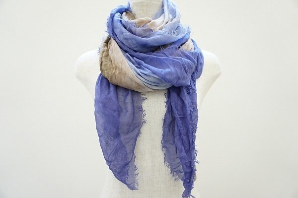 こちらのストールはブルーのグラデーションの中に落ち着いたベージュがアクセントとなっており美しい色使いが目を引きます。カシミア混なので肌触りも良く高級感が漂います。暖色系、寒色系、どちらのコーディネートにも使えるので一枚持っていると大活躍してくれそうですね。
