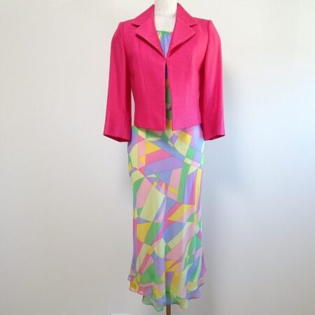 宅配買取にて銀座マギーのワンピーススーツを買取しました。遠くから見ても華やかで明るいワンピーススーツ。女性の華やかさを見事に演出してくれます。