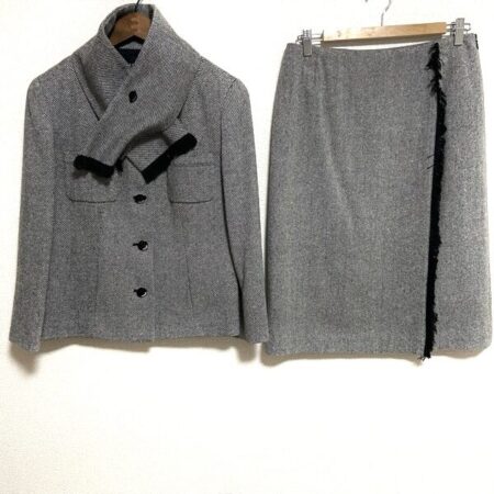出張買取にてマダムジョコンダのスカートスーツを買取しました。ちょうどいい濃さのグレー。大人女性ならではの落ち着きと安心さを感じさせてくれます。どんな色、柄にも合わせやすいので1セットあると安心しきってしまいますね。
