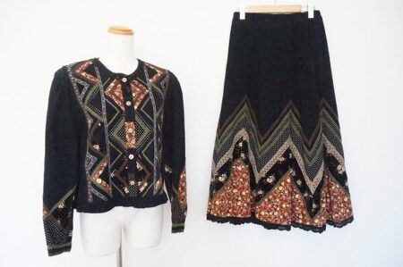 当店出張買取ご利用のお客様よりノンノンドールのセットアップを買取しました。華やかでどこかレトロな雰囲気を感じるセットアップが入ってきました。クールさに加えて華やかさや豪華さをきちんと出してくれる贅沢なセットアップです。ゴージャスな装いに仕上げたい時に手に取りたいアイテムですね。