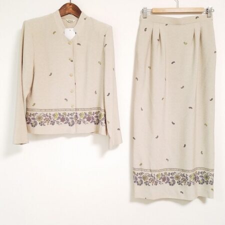 出張買取にて三年坂のセットアップを買取しました。サイズはMです。柔らかいベージュに品のいい柄が映えます。カジュアルながらも清楚感はばっちりなお洋服ではないでしょうか。スリムな印象にもしていただけます。
