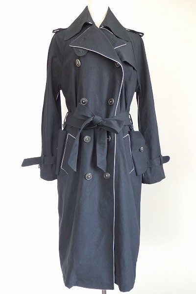 フロントのヘムやポケットの縁取りに使われているホワイトのパイピングが強い印象を和らげ、クールな中にフェミニンな一面も感じさせるトレンチですね。