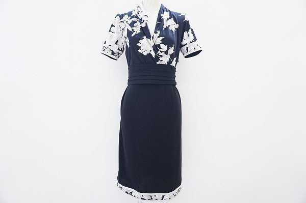 レオナールといえば鮮やかな色遣いや、フラワープリントを思い浮かべる方が多いのではないでしょうか。そんなレオナールでは珍しいシックな色合いのワンピースを買取りました。シックな色合いの中にもフラワープリントが光り、レオナールらしいデザインとウエストの切替が特徴的なお品物です。