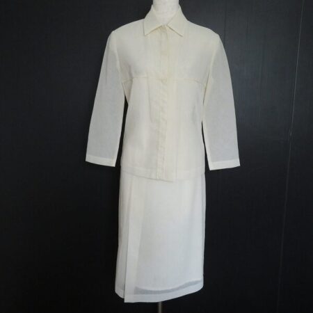 出張買取でシビラのスカートスーツを買取しました。白の透明感、シースルーな雰囲気とちょっとメンズライクな雰囲気が見事に掛け合わさった1着ではないでしょうか。柄にも色物にも合わせやすいのも魅力です。