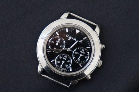 アニエスベー クロノグラフ 腕時計 本体のみを出張買取にて買取しました。シンプルでありながら、どこかスタイリッシュな印象の腕時計本体をお譲りいただいております。ブラック×シルバーのデザインで見やすくもかっこいい印象に仕上げてくれるアニエスベーならではのデザインです。
